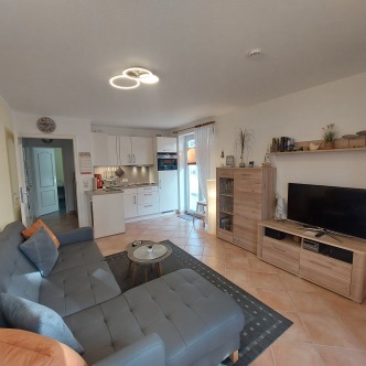- gefliestes Bad mit modern beleuchteten Spiegel und Uhrzeitangabe
